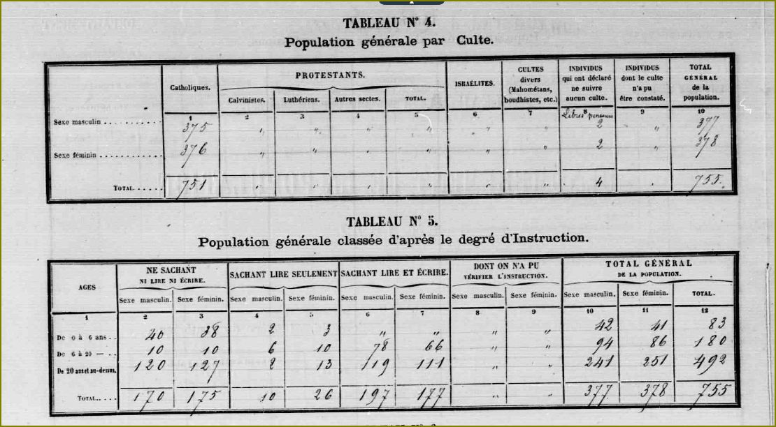 - 751 se déclare catholiques et seulements 4 sont sans religion (libres penseurs)